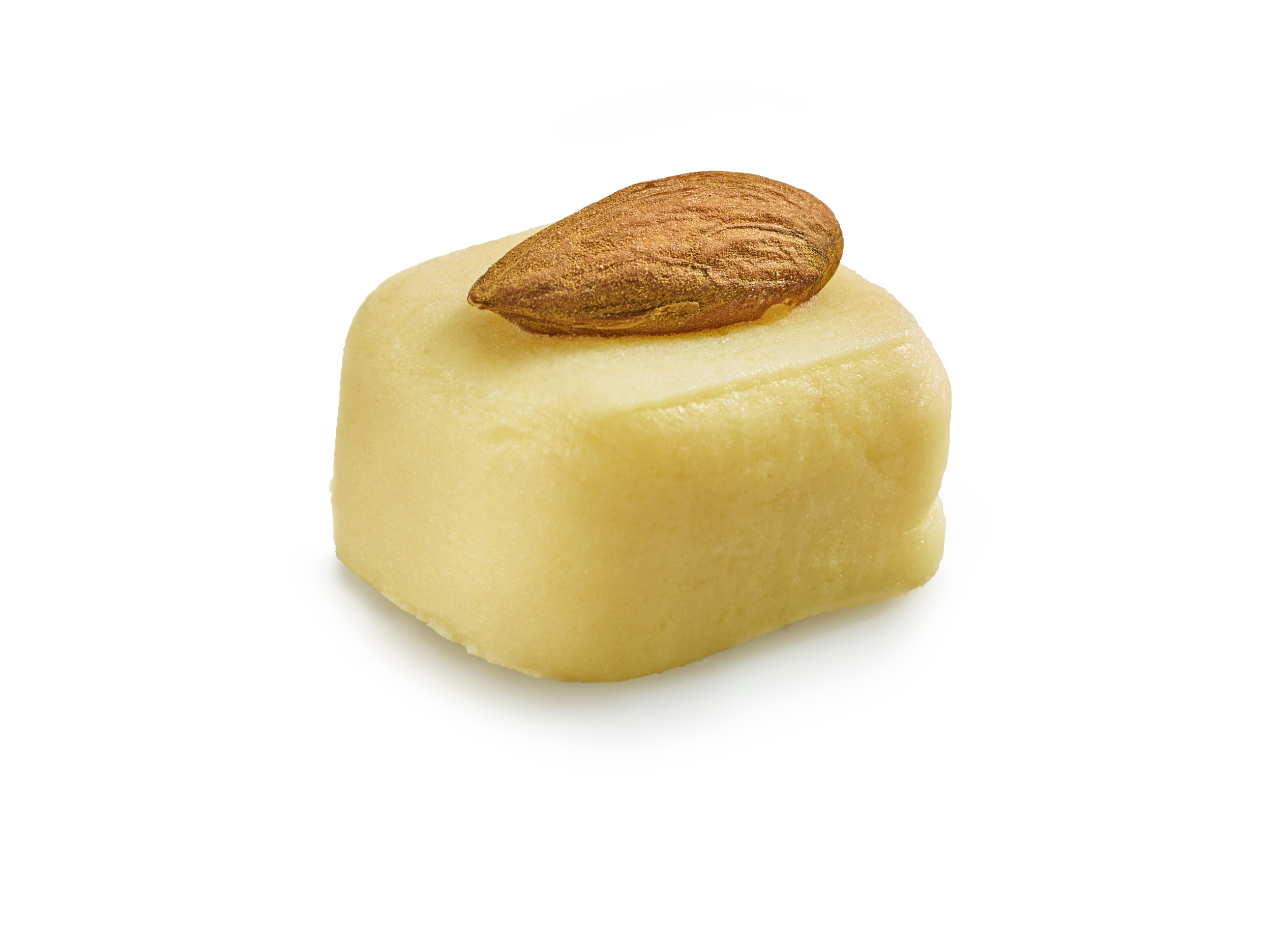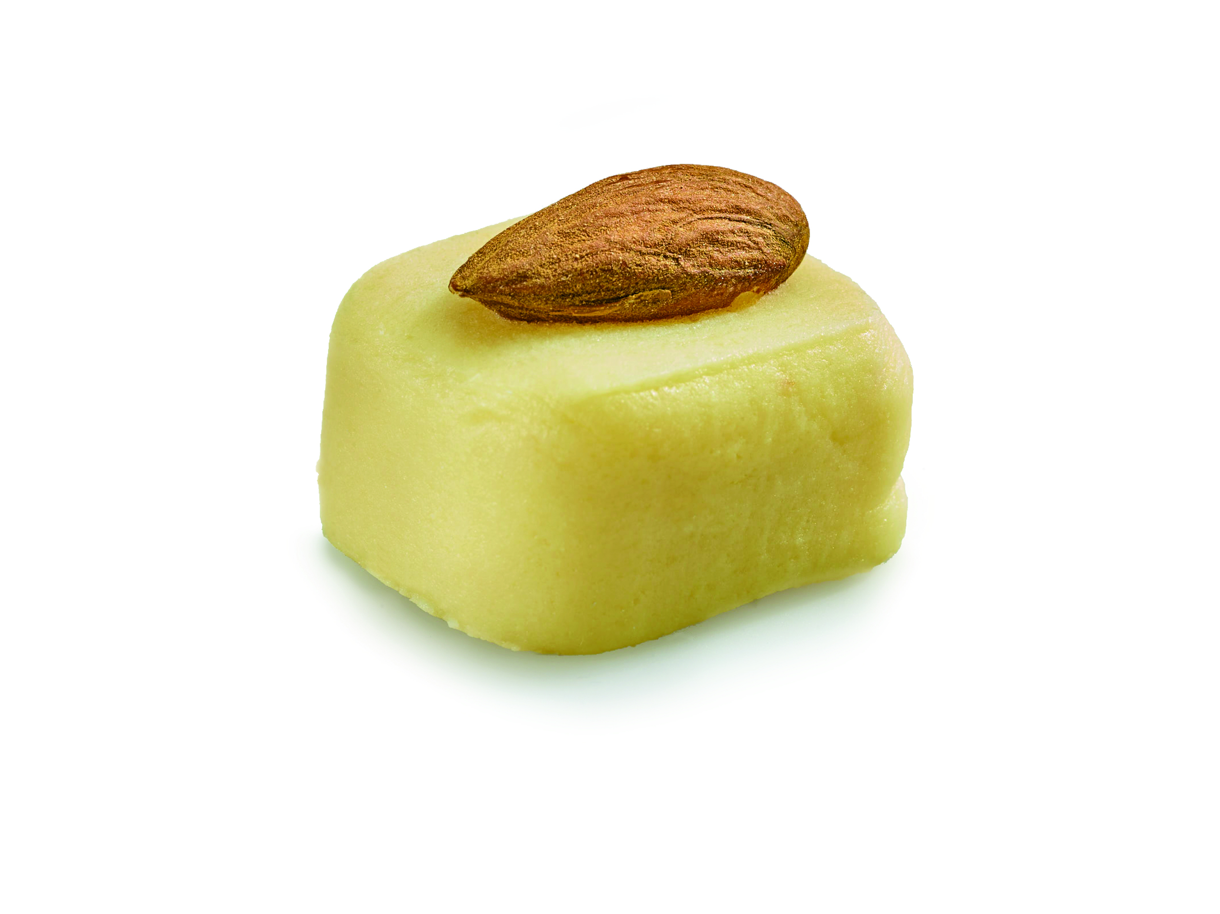 Pure marzipan and its almond. Discover the essence of pure almond paste topped with a whole almond. Savor the delicate taste of plain marzipan, accented by the crunch of the almond.