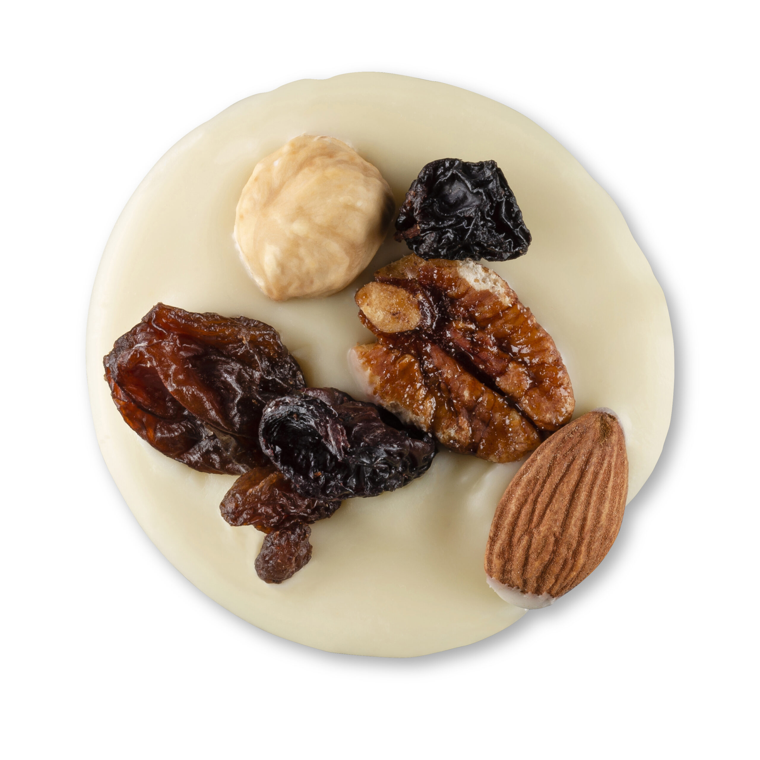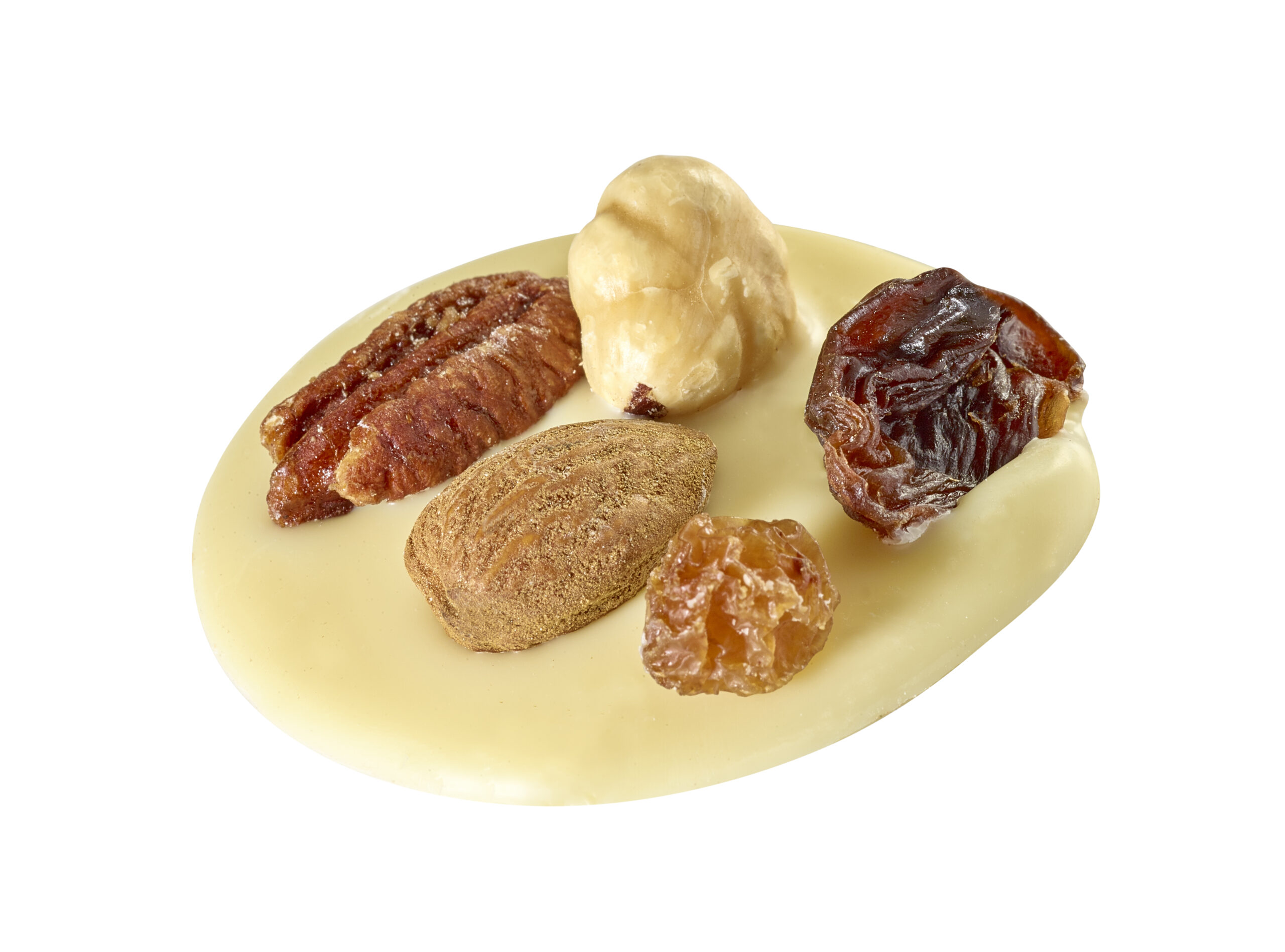 Assortment of crunchy flavors. Discover a white chocolate disc adorned with delicious dried fruits and a pecan nut, featuring sweet, milky notes. Savor this delicately crunchy creation that melts in your mouth.