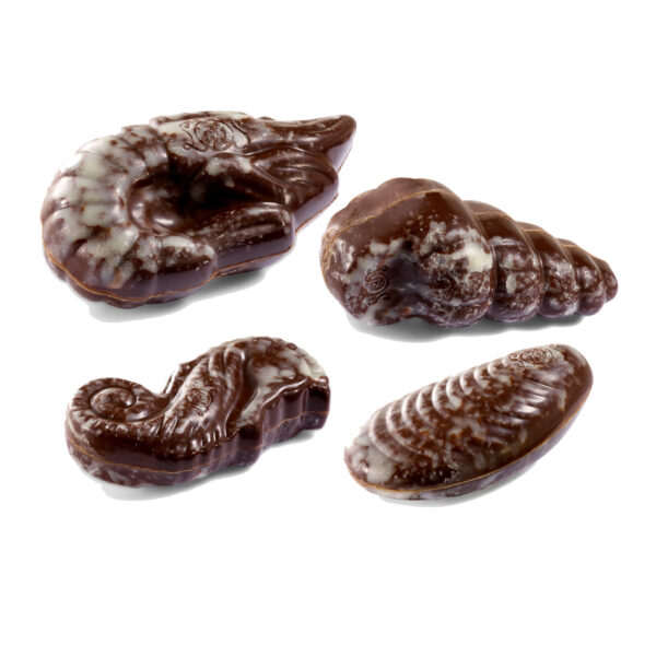Op zeevruchtenjacht! Geniet van gemarmerde pure chocolade, gevuld met karamelpraliné. Welke zomerse lekkernijen vis jij op: een zeepaardje, een schelp, een mossel of een garnaal?