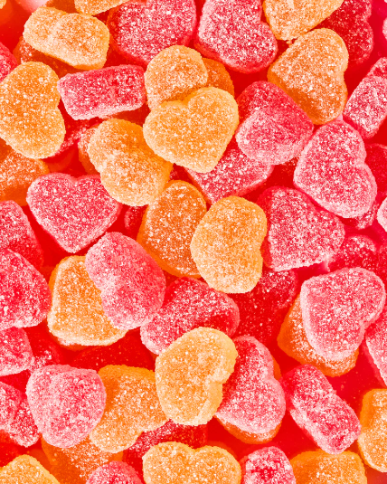Voedingsvezels (polydextrose, isomaltooligosaccharide*), zoetstoffen: erythritol, gelatine, voedingszuren (citroenzuur, appelzuur), zuurteregelaar (natriummalaat), natuurlijk aroma, voedingskleurstoffen (concentraat van wortel, pompoen, paprika, zwarte bes), steviolglycosiden (uit stevia). *bron van glucose.