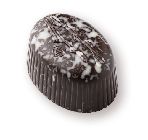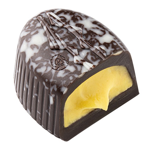 Une crème au beurre au fruit de la passion dans une coque de chocolat noir intense marbré.