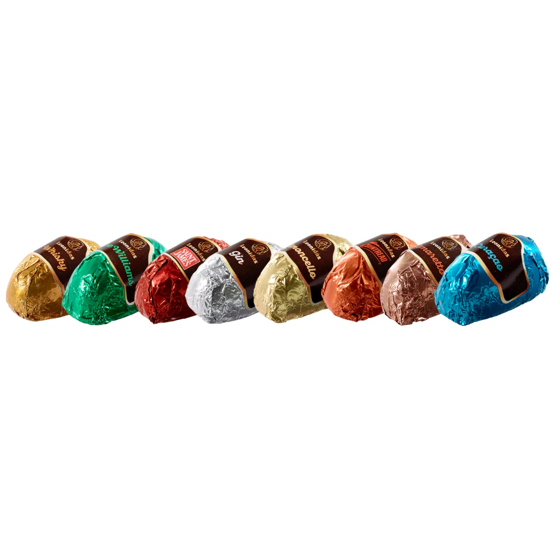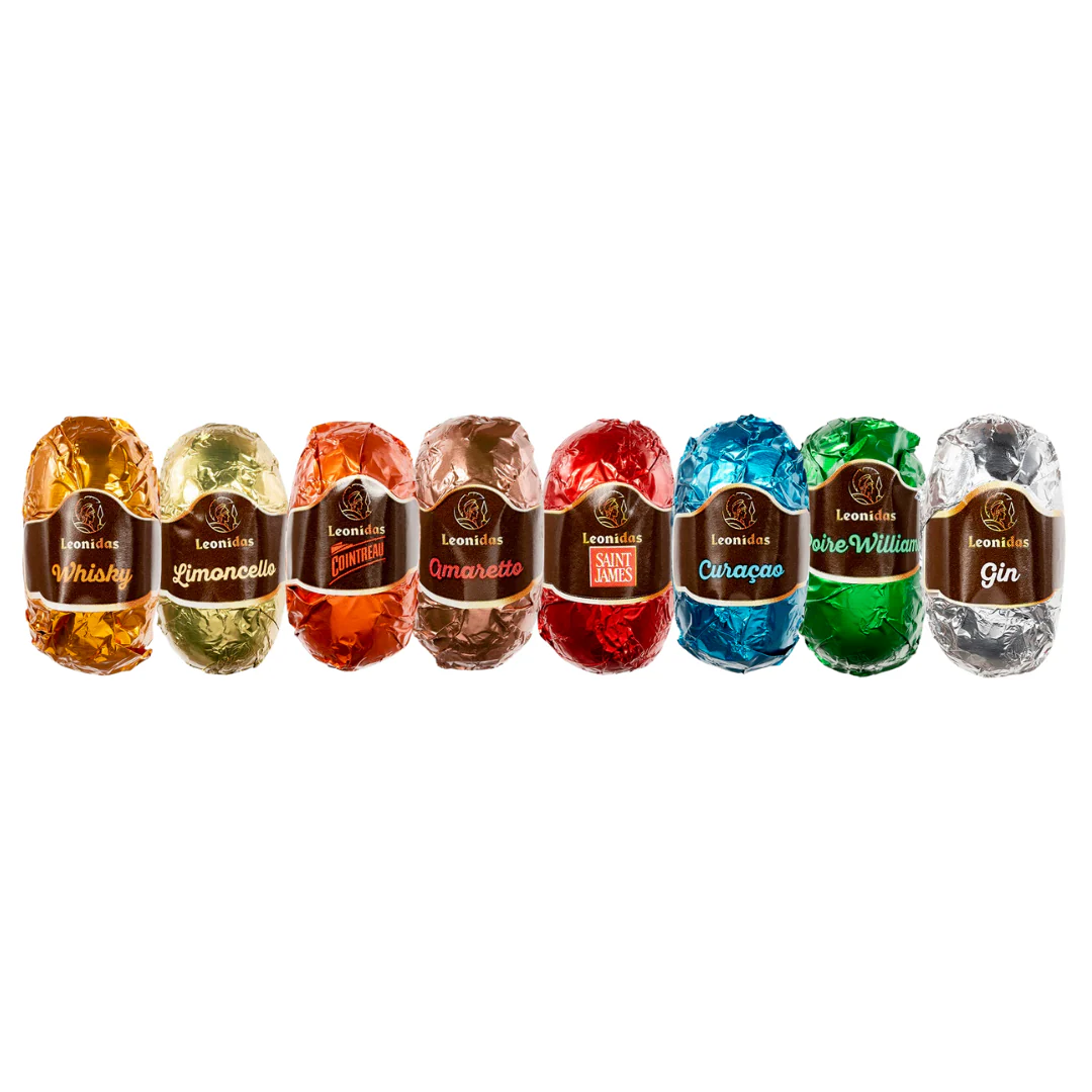 sucre, chocolat noir (masse de cacao, sucre, beurre de cacao, poudre de cacao maigre, émulsifiant : lécithine de soja) (28%), eau, liqueur (5%) (Rhum Saint James ®, Eau de vie Poire William®, Curaçao®, Gin, Amaretto® (noisettes, amandes), Cointreau®, blended Scotch Whisky, Limoncello)